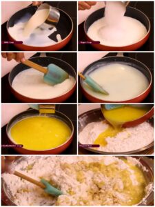 सगळ्यात आधी एका पातेल्यात दूध आणि साखर एकत्र करून गरम करायची. साखर पूर्णपणे विरघळेपर्यंत हे मिश्रण गरम होऊ द्यायचं आणि एक उकळी आली की गॅस बंद करायचा. या मिश्रणाचं तापमान थोडं कमी झालं की त्यात साजूक तूप घालायचं. हे तूप घट्ट नको, हलकं वितळलेलं असावं.